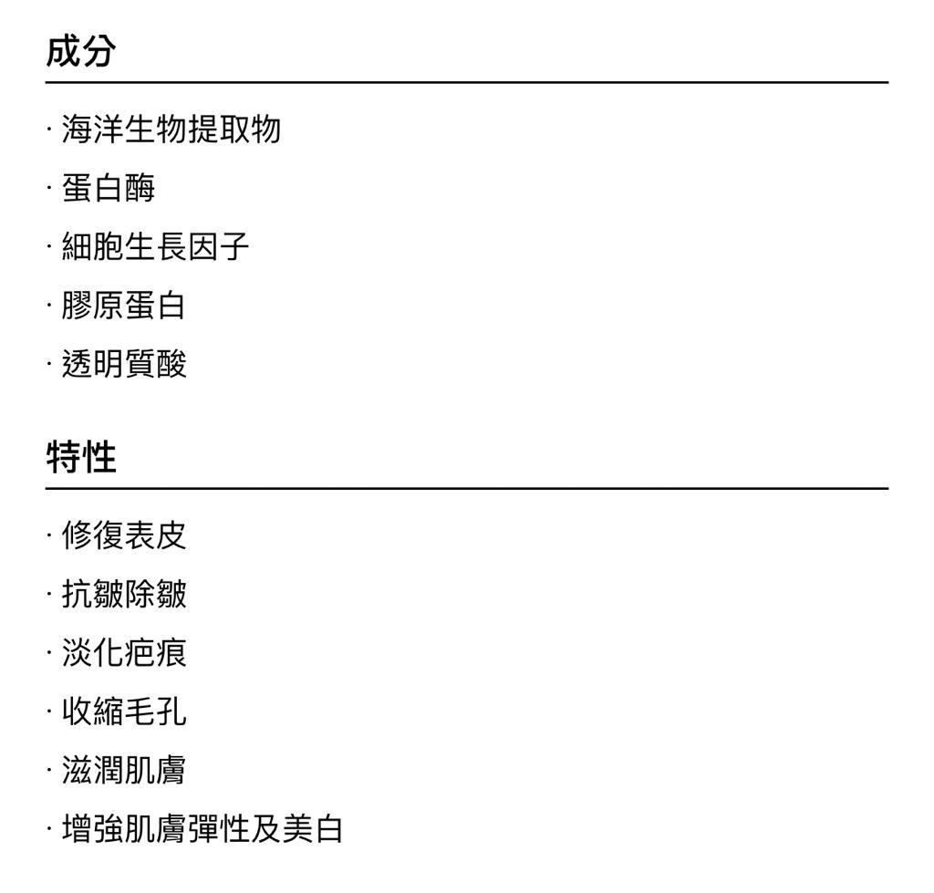 抗皺除皺、淡化疤痕、收縮毛孔、嫩滑肌膚 、光澤美白
